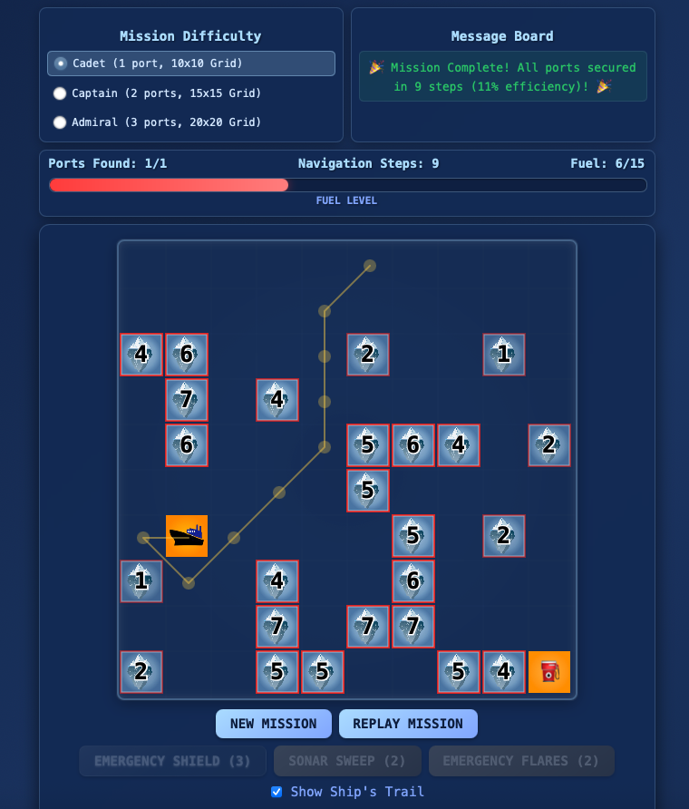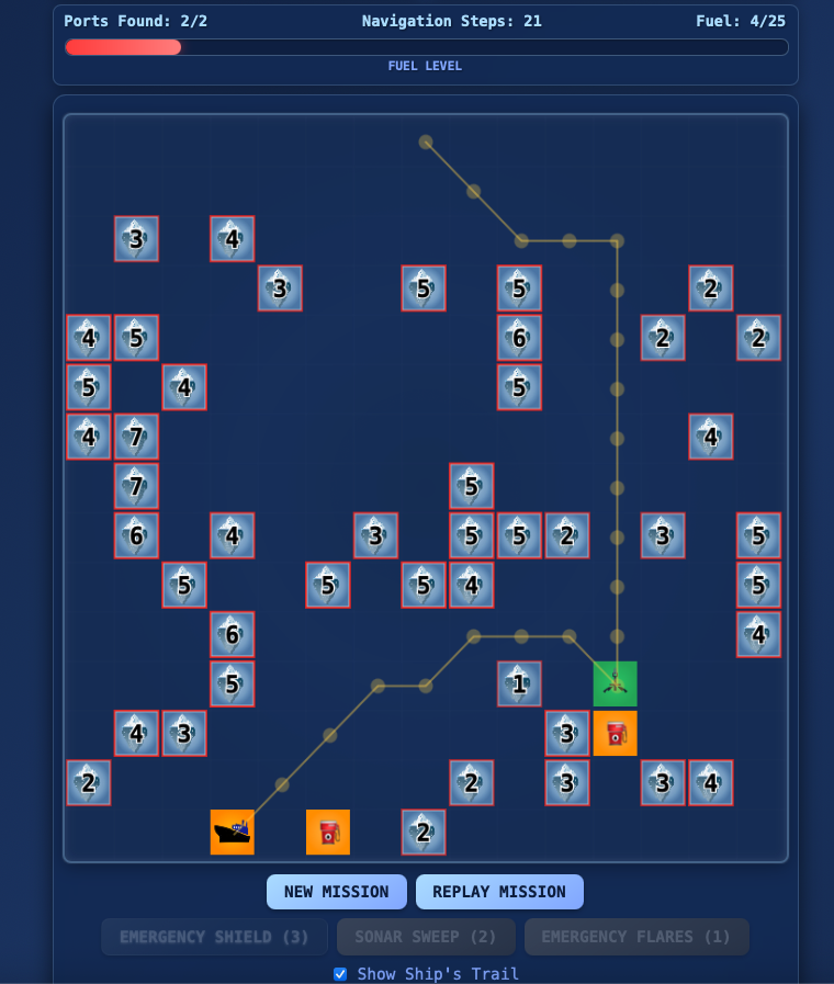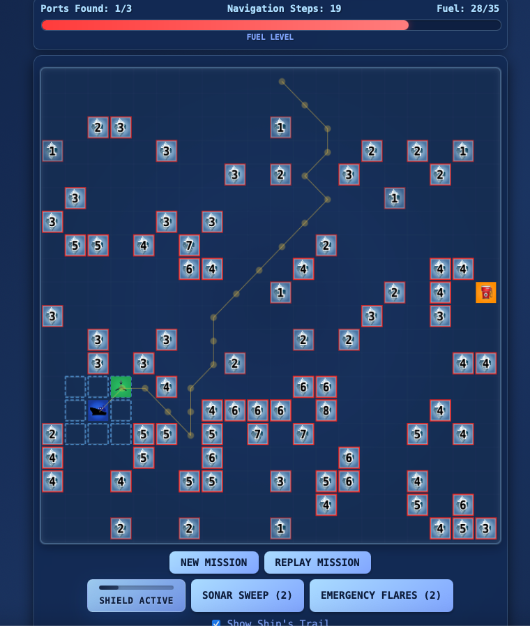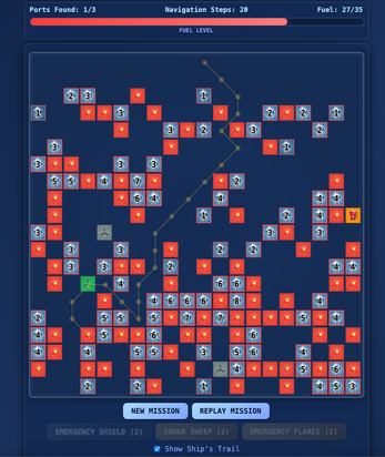 A strategic naval adventure where you pilot an icebreaker ship through dangerous Arctic waters. Navigate around hidden icebergs while managing limited fuel, sonar, shields, and flares to reach secret ports. Each move consumes fuel, so plan your route carefully between fuel stations. Use sonar to detect nearby icebergs, shields to survive collisions, and flares to reveal hidden ports. Three difficulty levels from Cadet to Admiral offer increasing challenges. Success requires strategic resource management and careful navigation through the frozen sea.